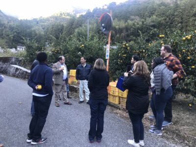 本プログラム訪米アルムナイである依光晃一郎高知県議会議員の協力で行われた高知プログラムでは、現地発の産業や地域の取り組みについての視察を行いました。130年の伝統を持ち海外進出にも積極的な酔鯨酒造、米国企業と長年の提携関係を持つミロク製作所、高知特産のゆず畑、高度な養殖技術を研究する山崎技研水産事業部を訪問し、関係者と幅広く意見交換を行いました。11月20日には、地元関係者による歓迎夕食会が開催され、冒頭、訪日団7名による米国政治セミナーを行い、各自の地元州の人口動態、産業、政治や社会のトレンドや日本との関係について紹介した他、次期大統領選挙の注目ポイントを米国の選挙システムや共和党・民主党、地域ごとの特性などそれぞれの視点を交えて解説を行いました。
