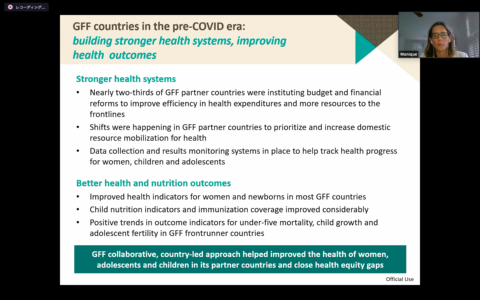 本セミナーでは、関係省庁、二国間援助実施機関、NGO、アカデミア等から母子保健、栄養、保健財政分野の専門家・実務家30名が参加し、性と生殖を含む母子および青少年の保健・栄養(RMNCAH-N)にCOVID‐19がもたらした副次的なインパクトと、それに立ち向かうためのGFF及びパートナー国・組織による独自の取組みについて、学びました。